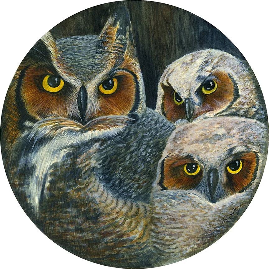 Great Horned Owl Family: Original watercolor painting. Approx 11.75” in diameter.